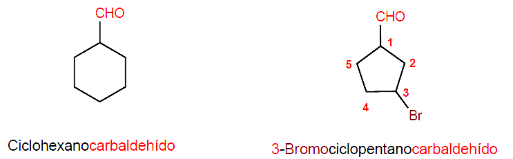 El grupo -CHO se denomina -carbaldehído. Este tipo de nomenclatura es muy útil cuando el grupo aldehído va unido a un ciclo. La numeración del ciclo se realiza dando localizador 1 al carbono del ciclo que contiene el grupo aldehído.